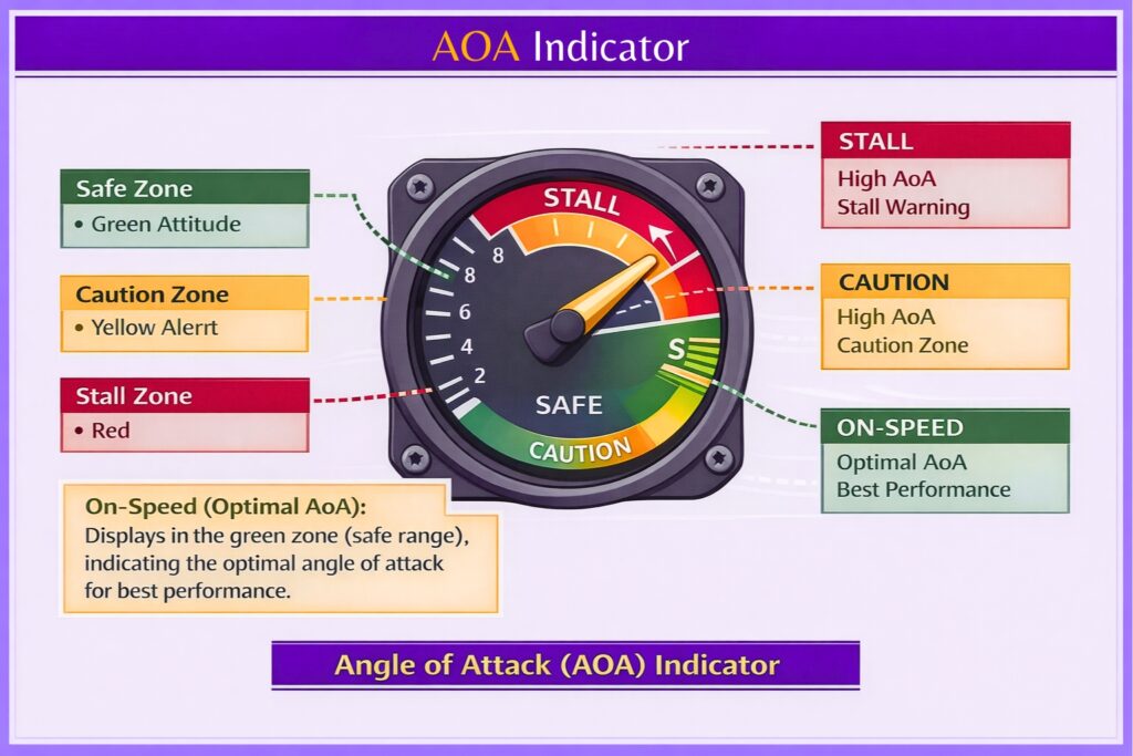 An angle of attack indicator provides real-time information about how close the wing is to its critical angle.